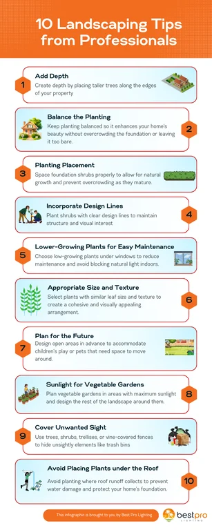 Add depth to the landscape by lining the outside of your property with taller trees. Smaller trees look better towards the front, which creates more depth and an overall cohesive design. Taller trees also look nice framing the home.